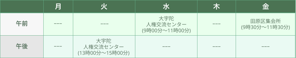 | 午前 | ー | ー | 大宇陀 人権交流センター (9:00〜11:00) | たかぎふるさとセンター (9:00〜11:00) | 田原集会所 (9:30〜11:00) |